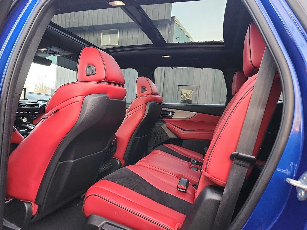 Apex Blue Pearl exterior and Red interior. Heated Leather Seats, Nav System, Third Row Seat, Aluminum Wheels, Moonroof, Panoramic Roof.