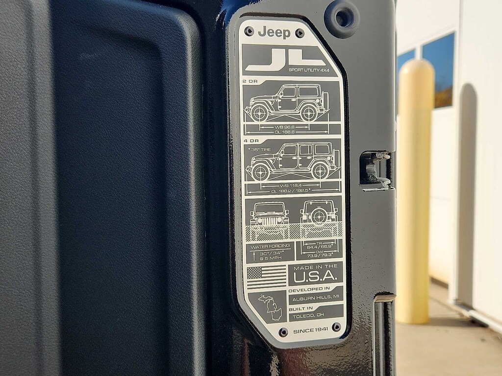 QUICK ORDER PACKAGE 23W WILLYS Engine: 3.6L V6 24V VVT UPG I w/ESS, Transmission: 6-Speed Manual, 7 & 4 Pin Wiring Harness, Conventional Differential Front Axle, 4-Wheel Drive Swing Gate Decal, Black Grille, Injection Molded Black Rear Bumper, Dana M210 Wide HD Tube Front Axle, Daytime Running Lamps LED Accents, Front LED Fog Lamps, LED Premium Reflector Headlamps, E-Locker Rear Axle, Corning Gorilla Glass, Security Alarm, Class II Receiver Hitch, Mold In Color Bumper w/Gloss Black, Advanced Brake Assist, Automatic Headlamps, Off-Road Plus Mode, Willys Hood Decal, Full Speed Forward Collision Warning Plus, Rock Protection Sill Rails, 97 MPH Vehicle Max Speed Calibration, Power Heated Mirrors, Enhanced Adaptive Cruise Control, Auxiliary Switches, Dana M220 Wide Rear Axle, Molded in Color, CONVENIENCE GROUP Emergency/Assistance Call, 2-Door Passive Entry, Front Door Locks, Remote Start System, Cluster 7.0 TFT Color Display, Universal Garage Door Opener, Heated Front Seats, Air Conditioning w/Auto Temp Control, Heated Steering Wheel, Air Filtering, BLACK 3-PIECE HARD TOP Freedom Panel Storage Bag, Rear Window Defroster, Rear Window Wiper/Washer, TRANSMISSION: 6-SPEED MANUAL (STD), ENGINE: 3.6L V6 24V VVT UPG I W/ESS (STD).
